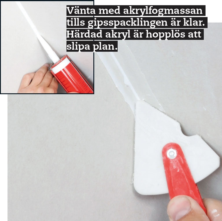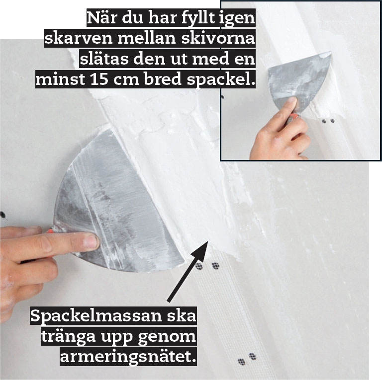 När samtliga gipsskivor har satts upp är det dags att spackla. Spacklingen ska inte bara skapa en plan yta som man kan måla eller tapetsera. Den ska också resultera i en stark konstruktion. Därför ska vi också armera mellan skivorna.