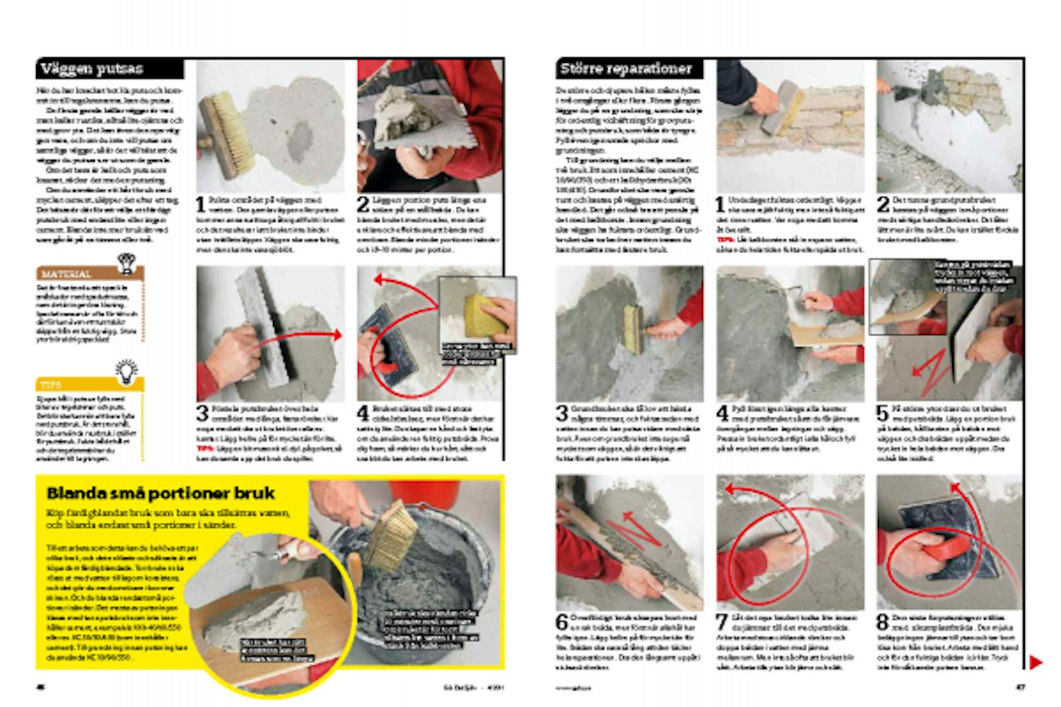 Om du har börjat med väggarna har du fått en grundläggande övning i konsten att putsa. Små reparationer kan du nu klara genom att bara trycka fast bruket på den genomfuktade ytan. När det första bruket har fått torka blir det lätt-tare att fortsätta med mera bruk.