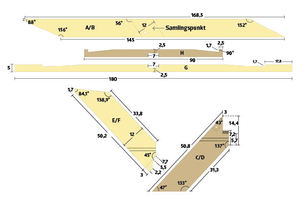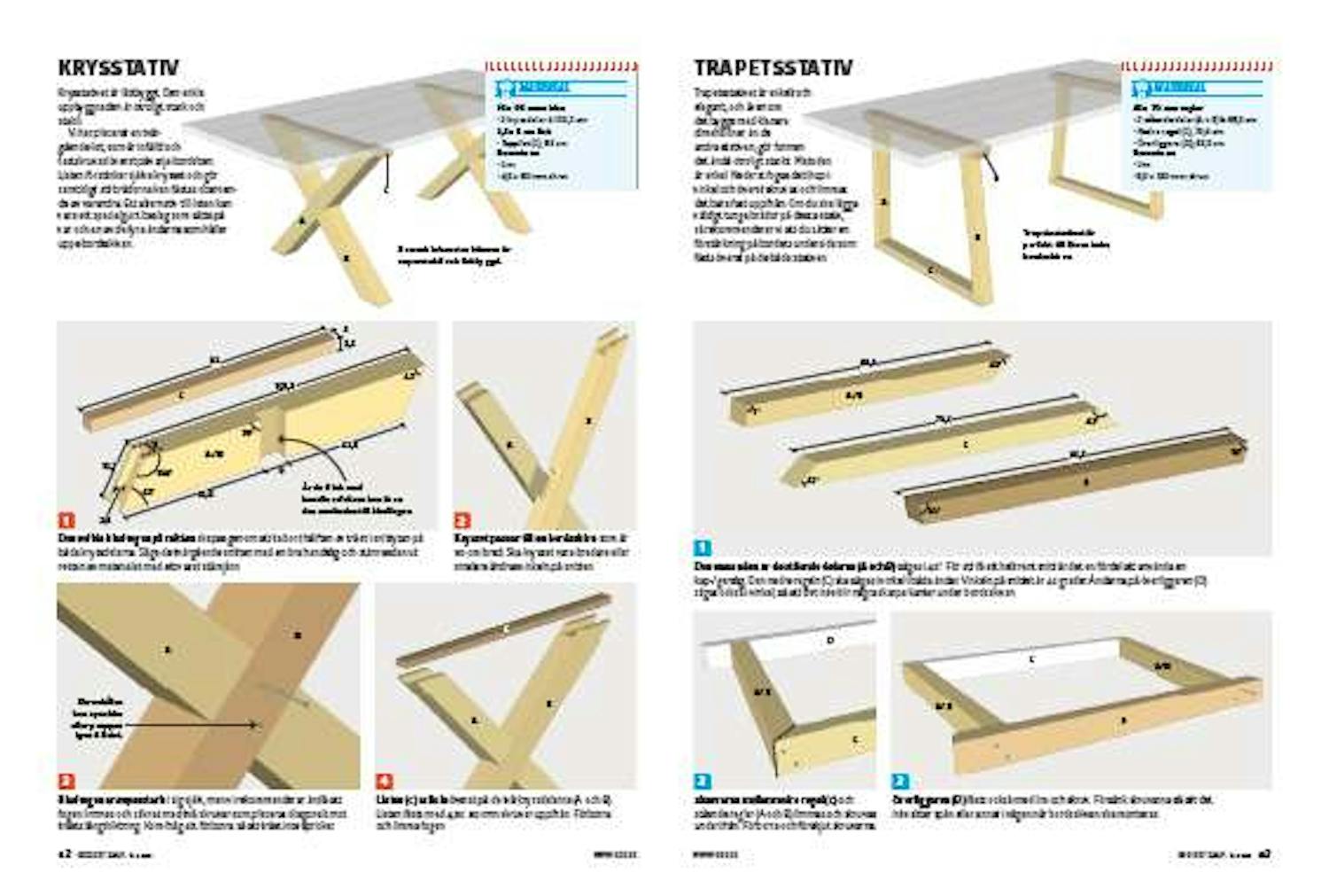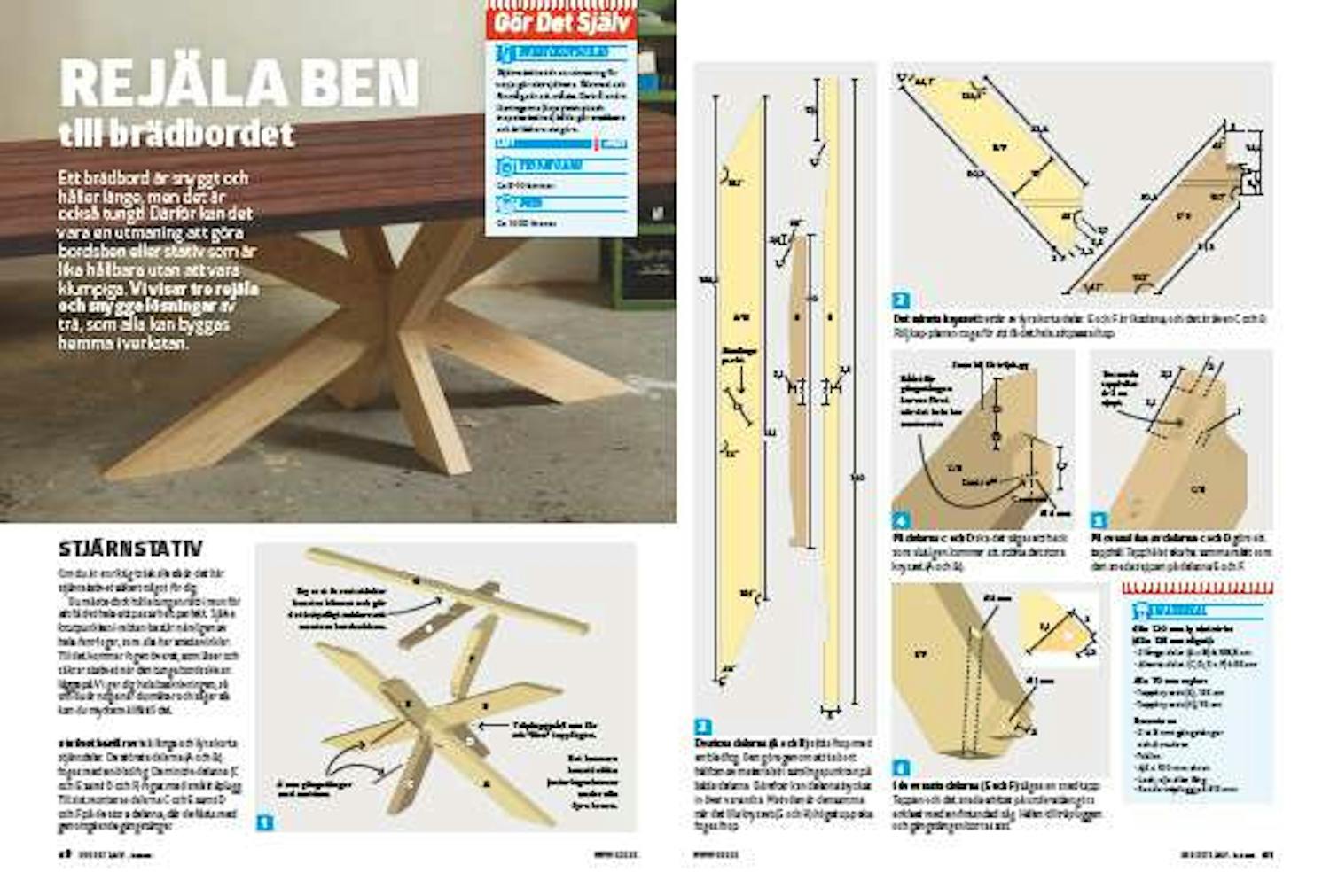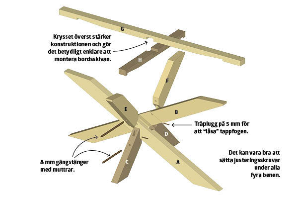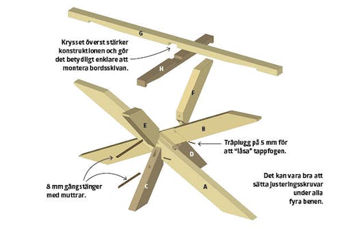 Själva knutpunkten i mitten består nämligen av hela fem fogar, som alla har sneda vinklar. Till det kommer fogen överst, som låser och säkrar stativet när den tunga bordsskivan läggs på. Vi ger dig hela beskrivningen, så om du är noga när du mäter och sågar så kan du mycket väl få till det.