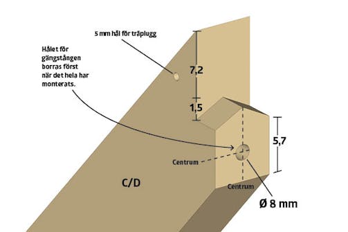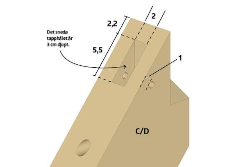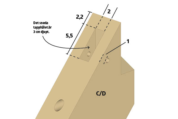 På ovansidan av delarna C och D görs ett tapphål. Tapphålet ska ha samma mått som den sneda tappen på delarna E och F.