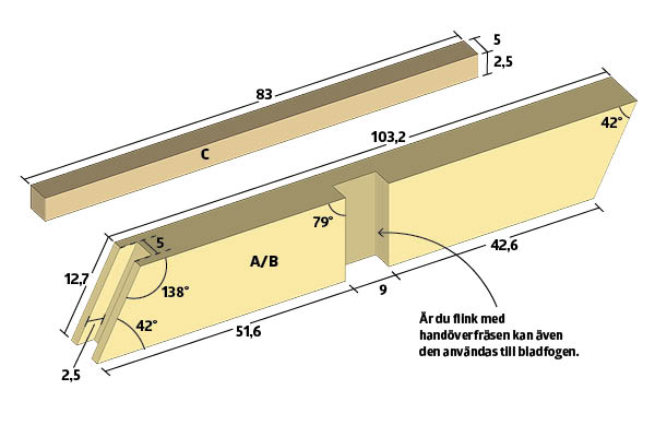 Den ena änden av de stående delarna (A och B) sågas i 45°. För att få ett helt rent snitt är det en fördel att använda en kap-/gersåg. Den nedre regeln (C) ska sågas i vinkel i båda ändar. Vinkeln på snittet är 42 grader. Ändarna på överliggaren (D) sågas också i vinkel, så att det inte blir några skarpa kanter under bordsskivan.