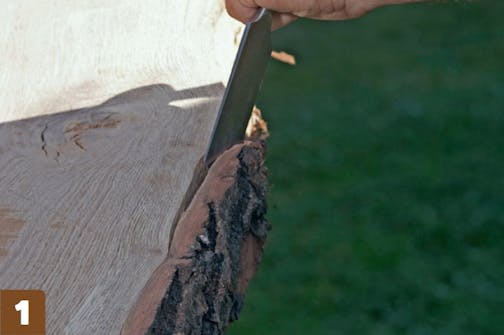 Ta bort barken på plankorna med t.ex. ett stämjärn eller en bandkniv. Om du använder stämjärn ska du vända fasen mot träet så att eggen inte skär in i kanten och gör jack. Då måste du slipa mera.