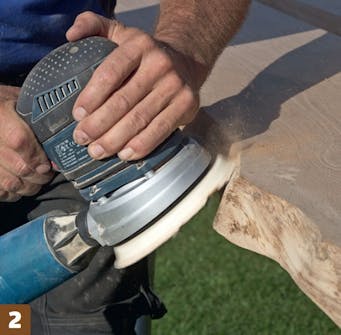 Slipa kanterna med en excenterslip och låt den följa träet form. Slipa i flera omgångar och ta god tid på dig. Börja med korn 6080, fortsätt med korn 20 och avsluta med t.ex. korn 150 eller 180. Håll slipen i rörelse.