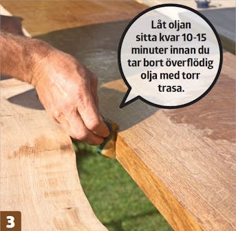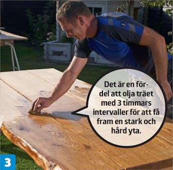 Ytbehandlingen av allt trä är mycket viktig om du låter plankbordet stå utomhus. Här har vi använt en olja som egentligen är avsedd för trädäck, altaner och terrasser av trä, Bona Decking Oil, och den hittar du i välsorterade golvaff ärer.