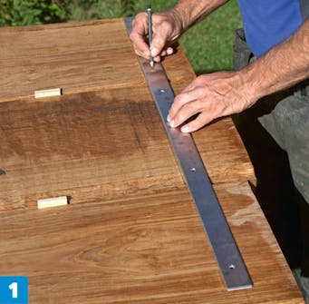Mät upp för plattjärnen på undersidan av plankorna Här väljer vi att använda tre järn, ett i varje ände och ett på mitten. Vill du ha avstånd mellan plankorna ska du sätta i lister eller liknande mellan dem.