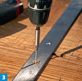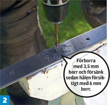 Borra hål i plattjärnen (om du inte har bett smeden göra det). Du bör dra i minst två skruvar i varje planka för att stadga träet. Till ek används rostfria skruvar.