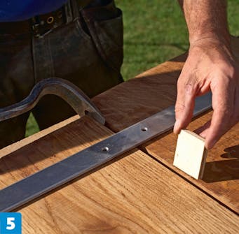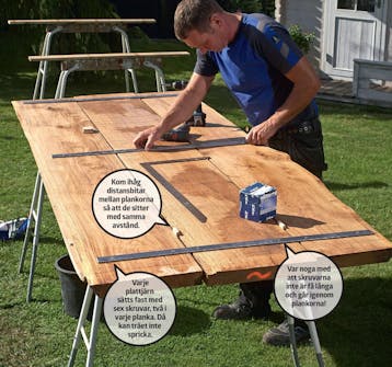 Om det visar sig att plankorna inte är exakt lika långa när du har monterat benen, så sågar du av plankorna. Till det ska du helst använda sågskena (eller anhåll) och cirkelsåg.