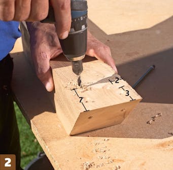 Sätt ihop delarna och borra vidare genom överliggaren in i benen. Håll ihop delarna ordentligt medan du borrar. Stryk sedan lim på skarvytan innan du drar i skruvarna.