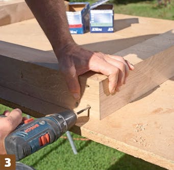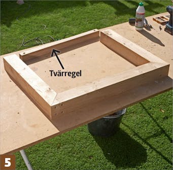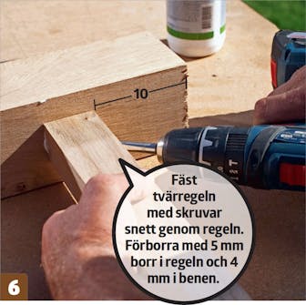 Tvärregeln fästs med 5 x 70 mm skruvar men den ska dessutom limmas fast med utelim. När benen har satts ihop till bockar kan du slipa dem lätt med excenterslipen.
