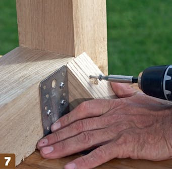 Fäst benen. Börja med att fästa dem med vinkelbeslag och 5 x 40 mm skruvar. De ser till att benen inte kan ge sig utåt. På utsidan placeras en trekantig träbit som hindrar benen att ge sig inåt. Glöm ej att förborra.