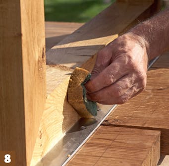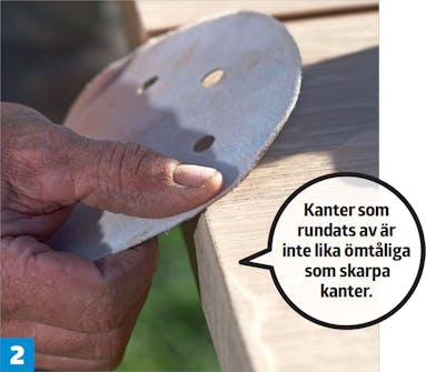 Slipa kortändarna när du har kortat av plankorna. Även om du har varit noga när du sågade så blir det lite ojämnt längs spåret. Fasa av kanten lätt med slippapper men använd inte maskin.