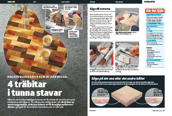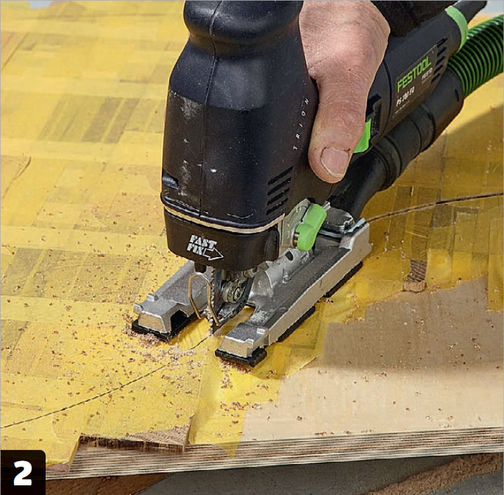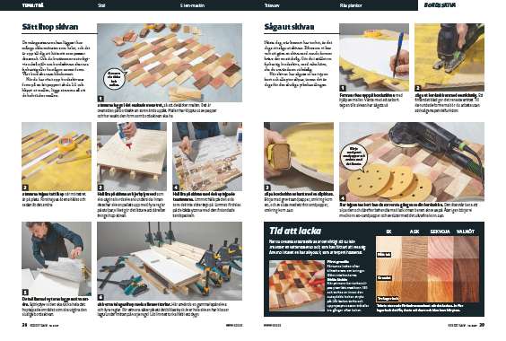 Nästa dag, när limmet har torkat, är det dags att såga ut skivan. Eftersom vi har valt att göra en skiva med runda former krävs det en sticksåg. Gör du i stället en fyrkantig bordsskiva, med raka hörn, ska du använda en cirkelsåg.