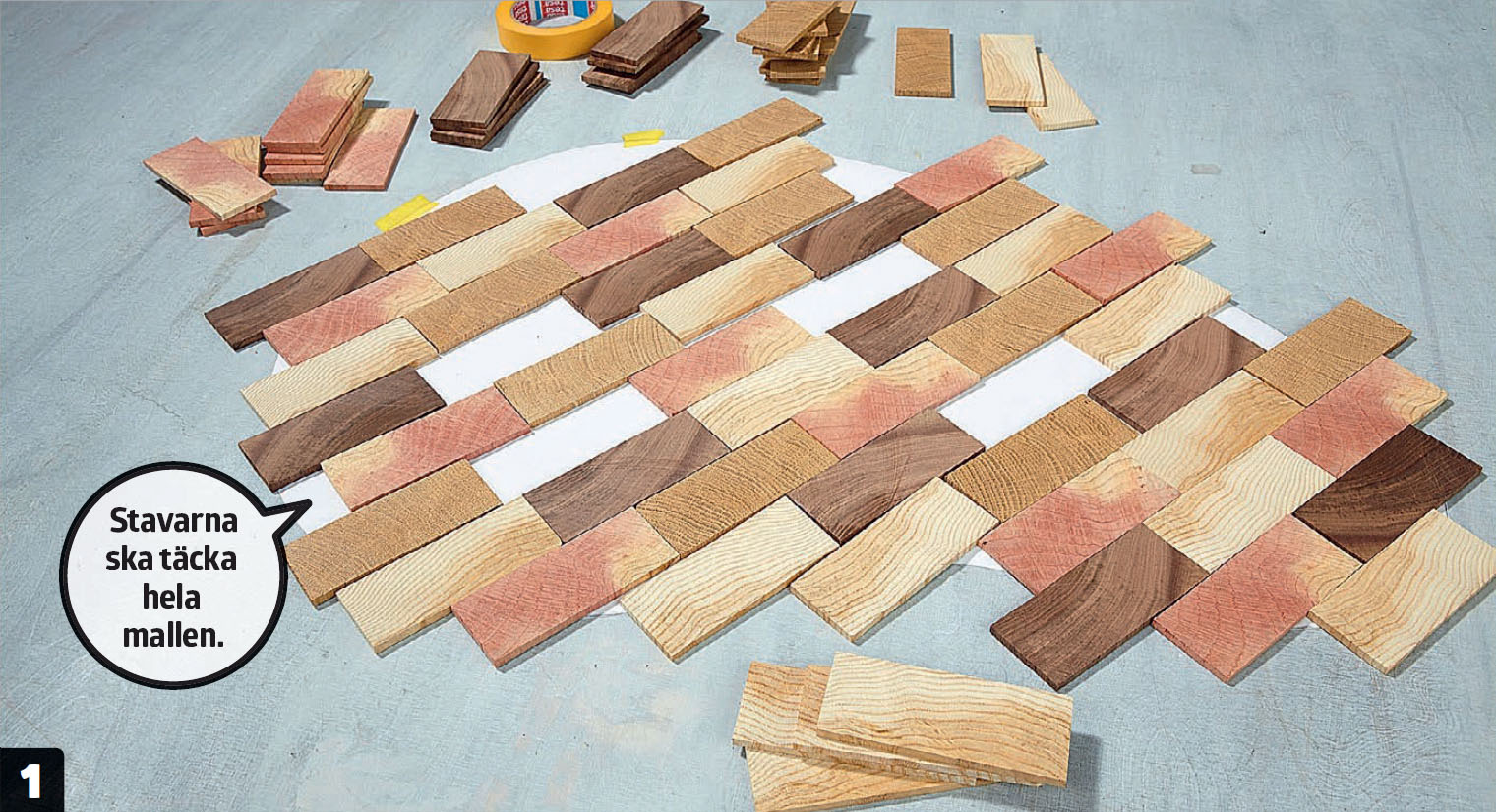 Stavarna läggs i det önskade mönstret, så att de täcker mallen. Det är ovansidan på bordsskivan som vänds uppåt. Mallen har klippts ut av papper och har exakt den form som bordsskivan ska ha.
