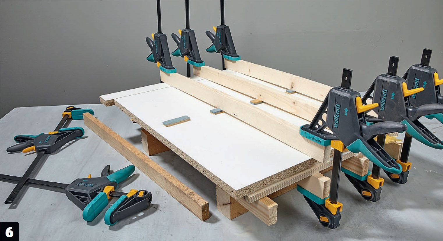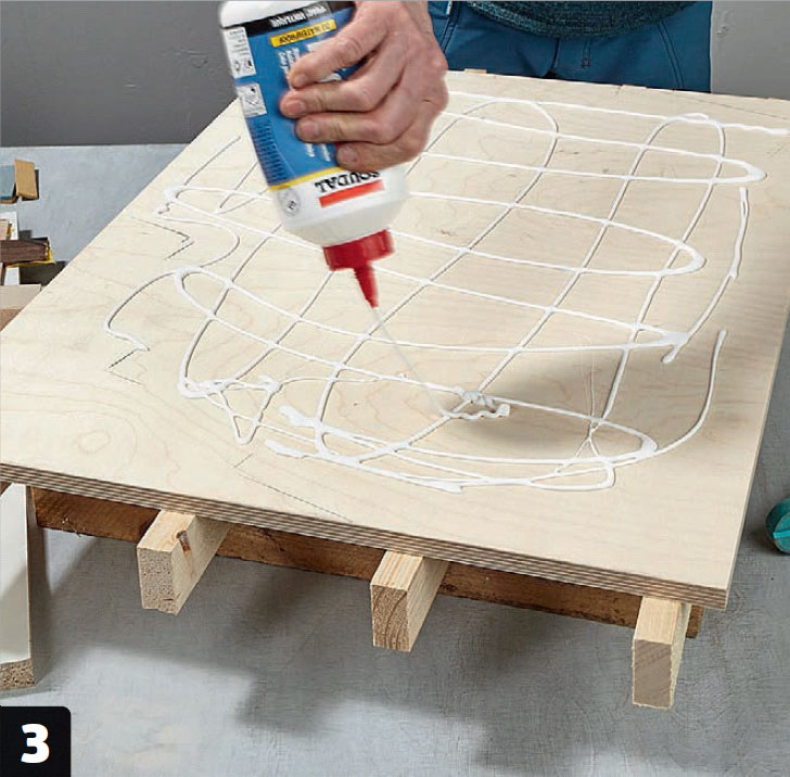 Häll lim på skivan av björkplywood som ska utgöra bordsskivans undersida. Innan dess har skivan pallats upp med fyra reglar på stolpar, vilket gör det lättare att därefter tvinga ihop skivan.