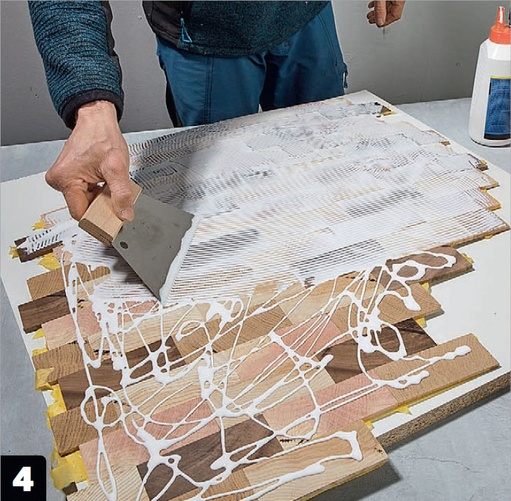 Häll lim på skivan med de hoptejpade trästavarna. Limmet hälls på den sida som det inte sitter tejp på. Limmet fördelas på de båda ytorna med den fintandade tandspackeln.