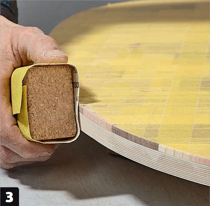 Slipa bordsskivans kant med en slipkloss. Börja med grovt sandpapper, omkring korn 80, och avsluta med ett fint sandpapper, omkring korn 240.