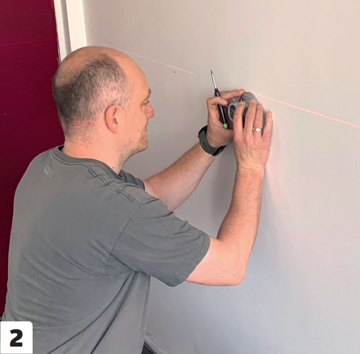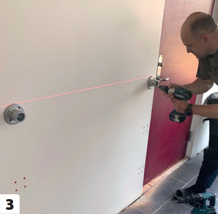 Alla hål borras och nästa väggfäste skruvas fast. Med hjälp av lasern sätts nästa på exakt samma höjd som det första. De går att justera lite om det skulle behövas.