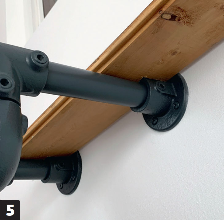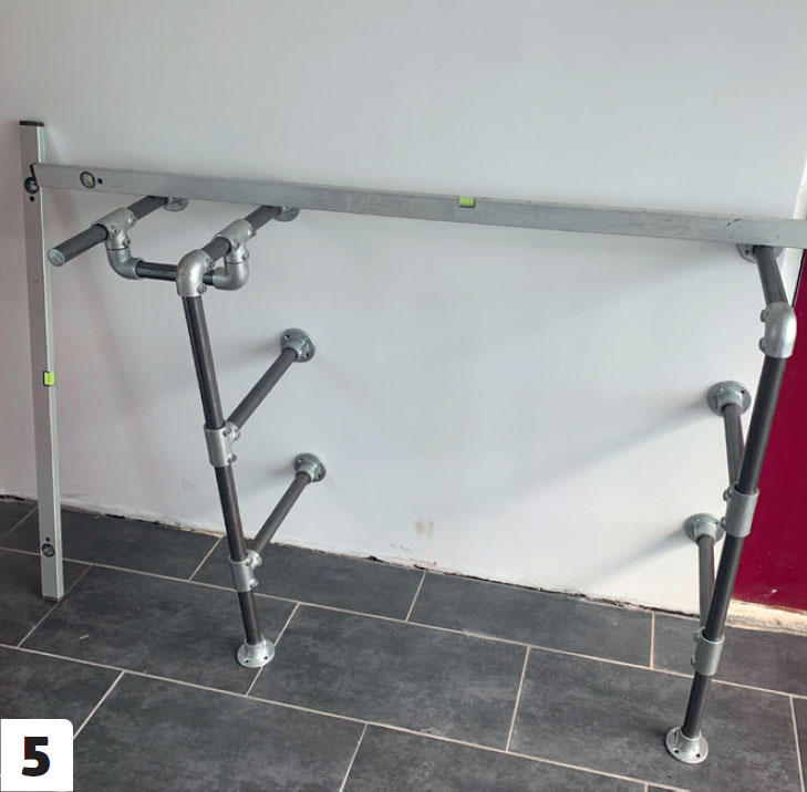 Vi sätter upp hyllan i lod men fäster den bara tillfälligt på väggen. Den ska tas ner igen och målas när vi är säkra på att alla rör har rätt längd och att alla delar är monterade precis som de ska.