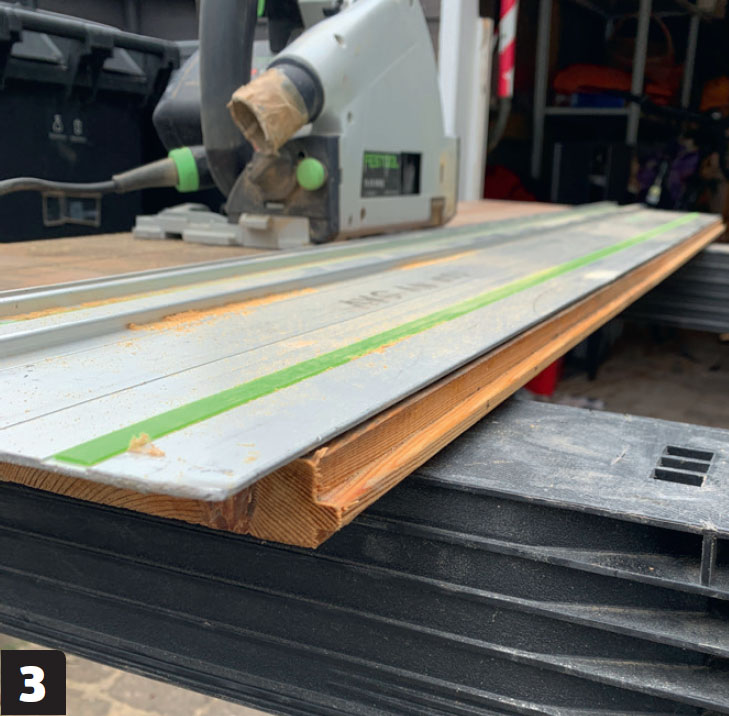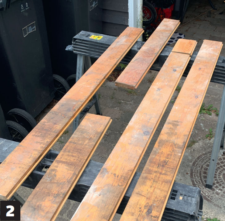 Nu är utsnitten gjorda. Eftersom brädorna endast monteras med not och fjäder kan de enkelt separeras så att man kan såga in från sidan på mittbrädorna.