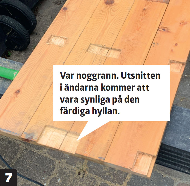 Hyllplanen sätts ihop. Ett hyllplan består av fyra brädor i bredd. Två brädor i mitten är skarvade. Det ger lite mer liv åt hyllans utseende än fyra lika långa brädor.