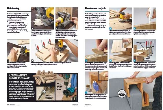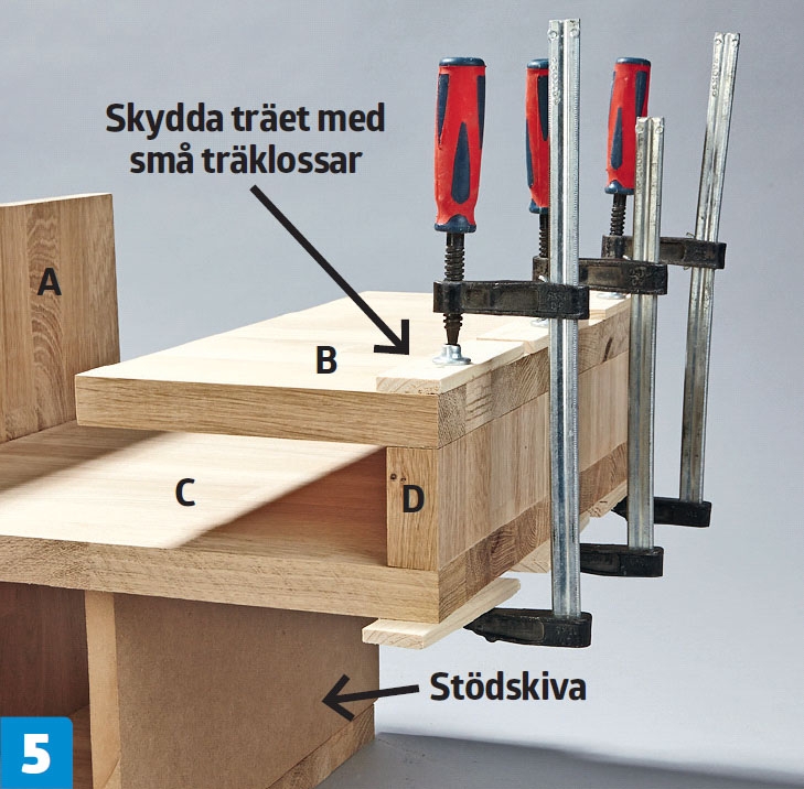 Tidningshyllan monteras. Använd skruvtvingar till att hålla konstruktionen på plats medan limmet torkar. Håll även hyllan uppe under torktiden med hjälp av en stödskiva.
