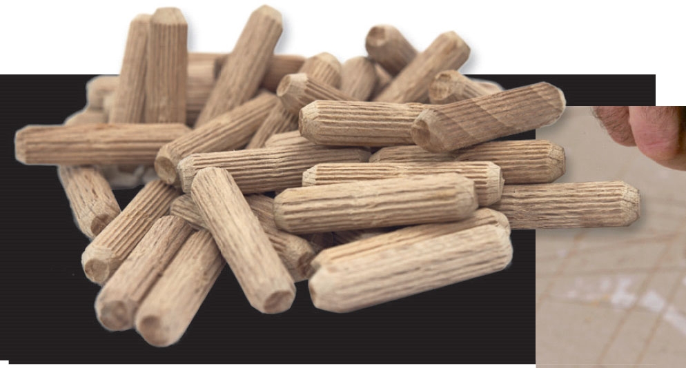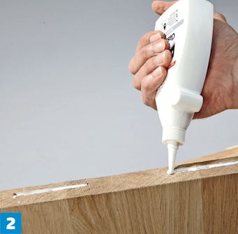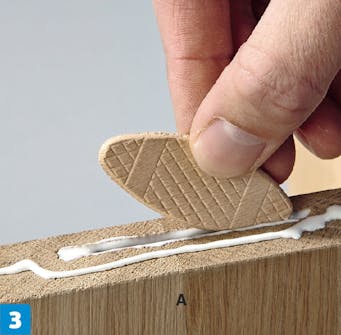 Utfräsningarna fylls med lameller. Stryk även lim på kanterna, där delarna ska limmas samman. Lamellerna pressas ned i limmet. De utvidgar sig med ca. 25 procent när de suger upp fukten från limmet.