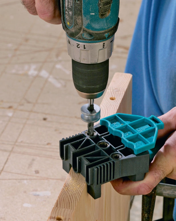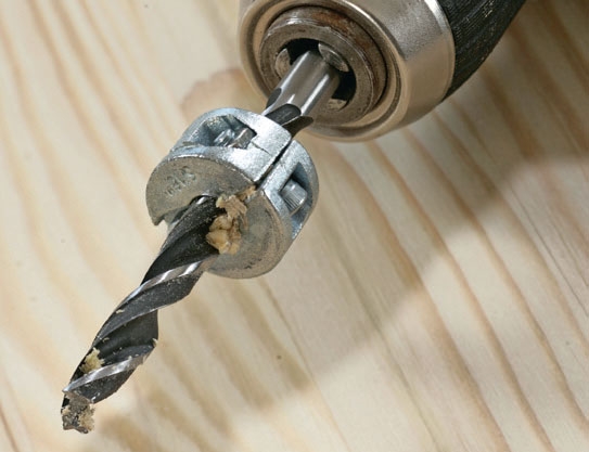 Om du inte har en lamellfräs, och inte vill köpa en, kan du använda vanliga träpluggar istället. Det är ett bra sätt att göra hållbara fogningar, men det är inte nödvändigtvis lättare än att använda lamellfräsen. Det är nämligen överraskande svårt att borra hålen helt rakt. Och om du inte borrar helt rakt blir fogningarna inte bra. Det finns dock ett ganska enkelt verktyg som kan hjälpa dig få helt raka hål när du borrar: en borrmall. En sådan kan köpas för runt 100 kr. För att göra hålet ännu mer precist kan du använda ett djupstopp.