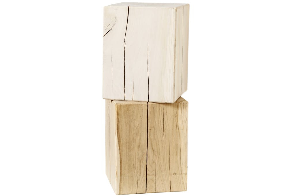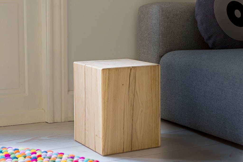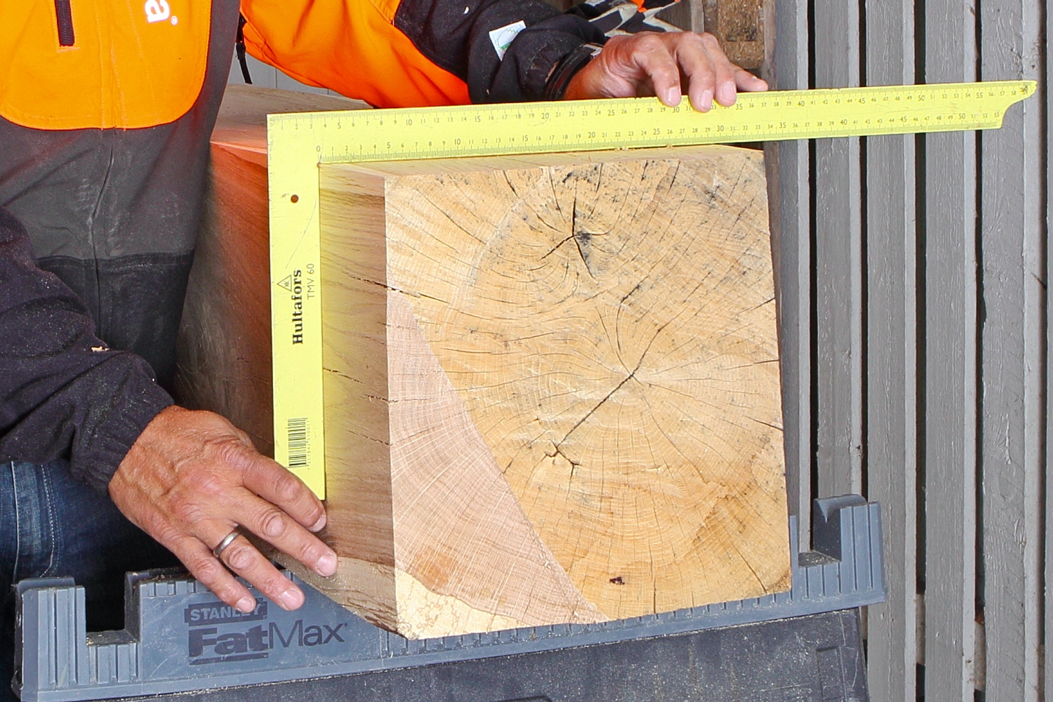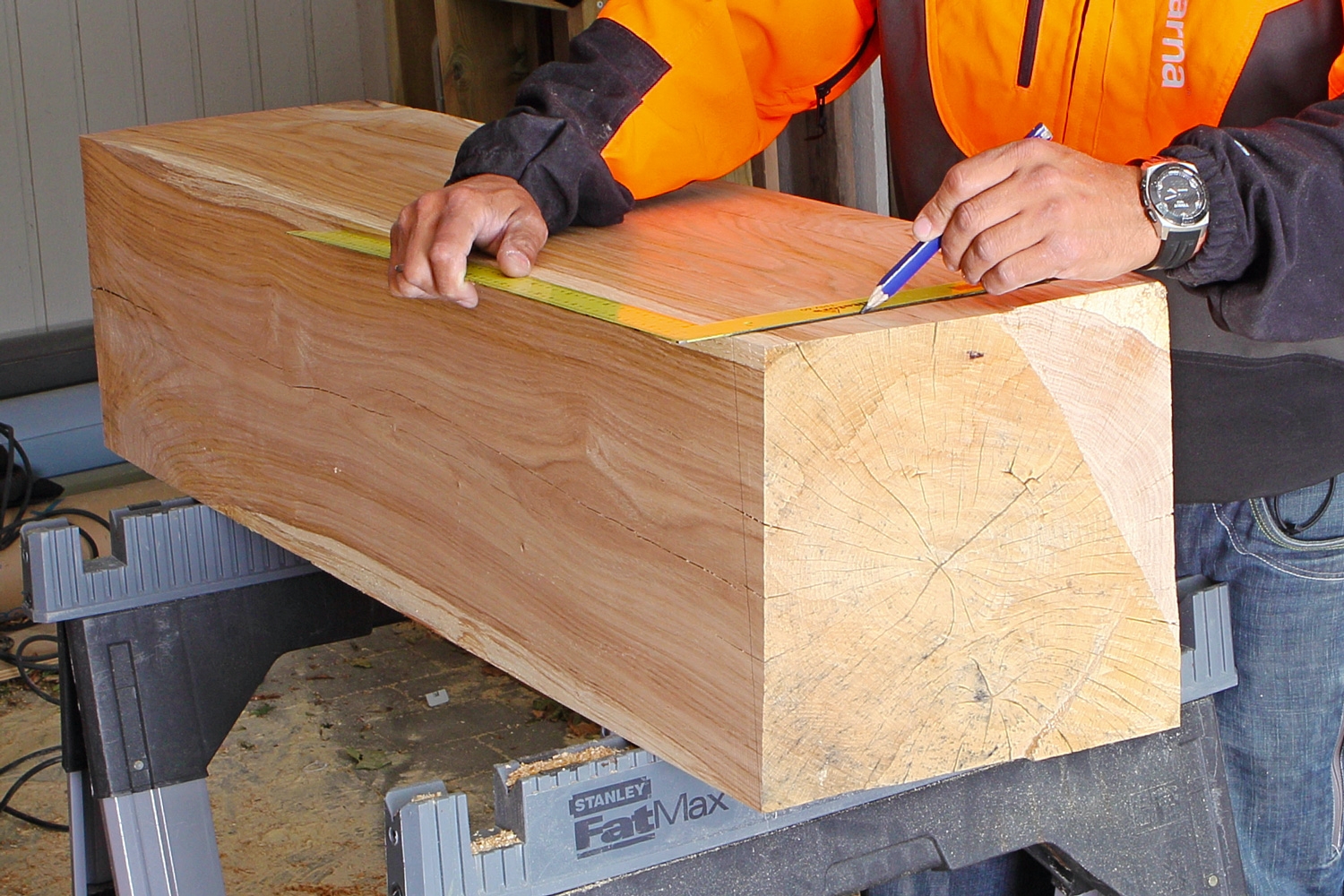 4. Mät och markera var kubben ska sågas till. Först sågas den till i ena änden, så den har en rätvinklad ändyta som du kan mäta ut pallen från. Det gör att pallen kan stå rakt. Gör markeringen med en stor.