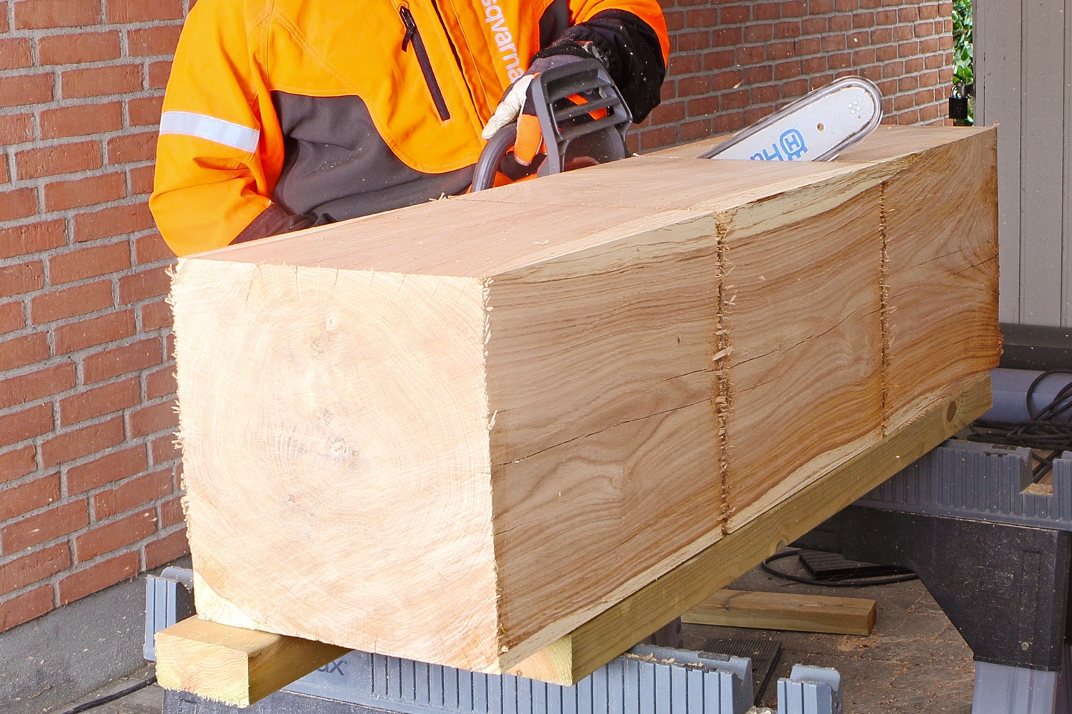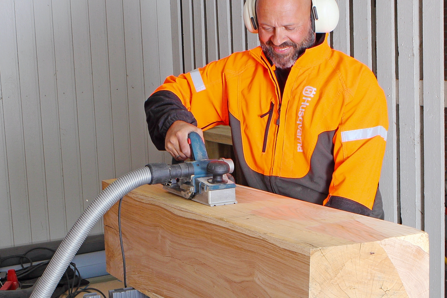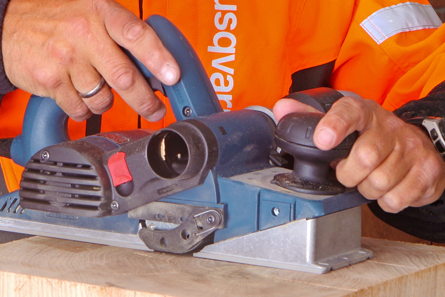 2. Virket hyvlas jämnt och i vinkel med en elhyvel. Se till att järnet är vasst, så det klarar att hyvla i den hårda eken. Ta endast lite åt gången eftersom timmer är dyrt!
