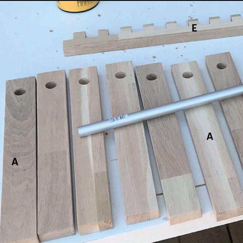 Såga ut delarna. Borra ett 8 mm hål genom hyllribbor (A) och de två liggande ändribborna (B) (syns inte på bilden). Hålen borras mitt på ribborna med ett centrumavstånd till kanten på 18 mm. Gör också bakstycket (E).