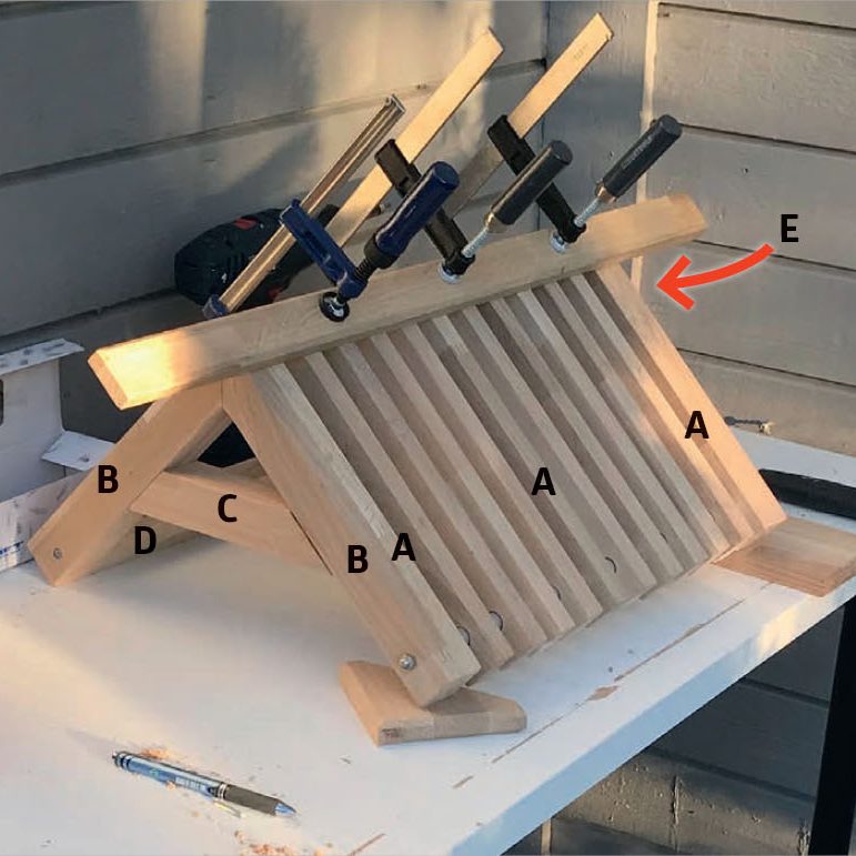 Limma och skruva fast tvärslåarna (C). De består av två bitar som har limmats ihop. De fästs med träplugg i de liggande gavlarna (B + A) medan de i de stående (B + F) får en lämplig skruv.