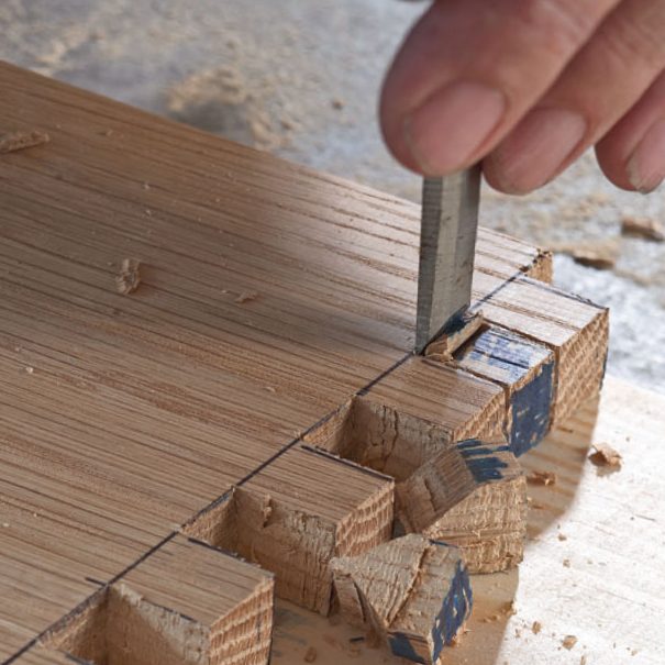 Börja med att markera hur breda och djupa tapparna ska vara, såga kanterna (se till att de blir likadana) och avsluta med att jämna till hacken med ett stämjärn.