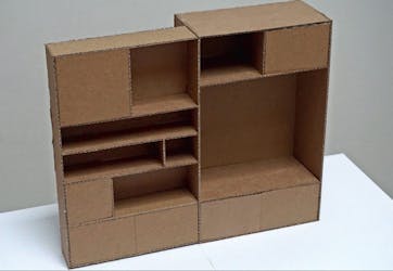 Placera ut de lodräta skivorna. Här placeras den smala skivan på sidan (E) upp mot väggen. Använd skåpen för att lägga på de vågräta skivorna, här en hylla (G). Då ser du att skivorna sätts ihop i 90 graders vinkel.