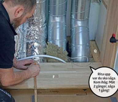 Börja med att lägga bordsskivan (F) så långt in mot hindren som möjligt. Här kan du se att skivan sticker ut 10 cm över sockeln när den ligger helt tätt in mot rören. Mät nu upp och rita ut var skivan ska sågas, så att fronten går in och kommer i linje med resten av bokhyllan.