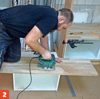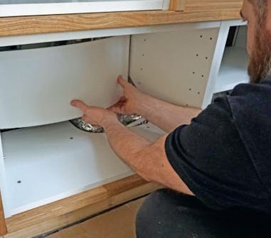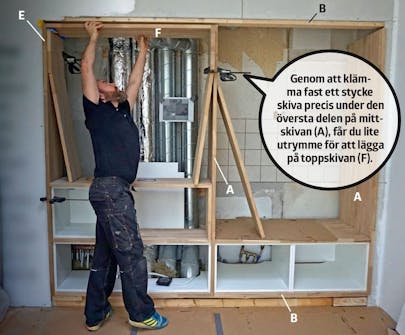 Precis som med skivorna sågar du ut i skåpen så att även dem passar runt hindren inuti på baksidan. Även här gäller det att planera snitten så att skåpens fronter/luckor går ut helt och är i linje med fronten.