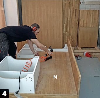Det är enklast att börja med att bygga den ena hälften på golvet. Här byggs den vänstra först. Om du ska använda golvet som "arbetsyta", säkerställer du att alla fronter på skivor och skåp hamnar i linje med varandra på ett perfekt sätt.