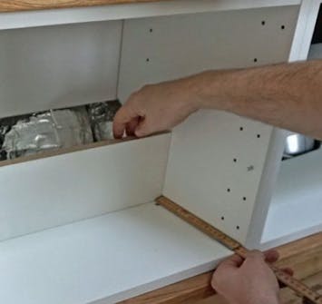 Såga efter blyertsstrecken och kom nu ihåg att dubbelkolla innan du börjar. Kom ihåg att det är lättast att arbeta när skivorna till baksidan har tagits bort från skåpen.