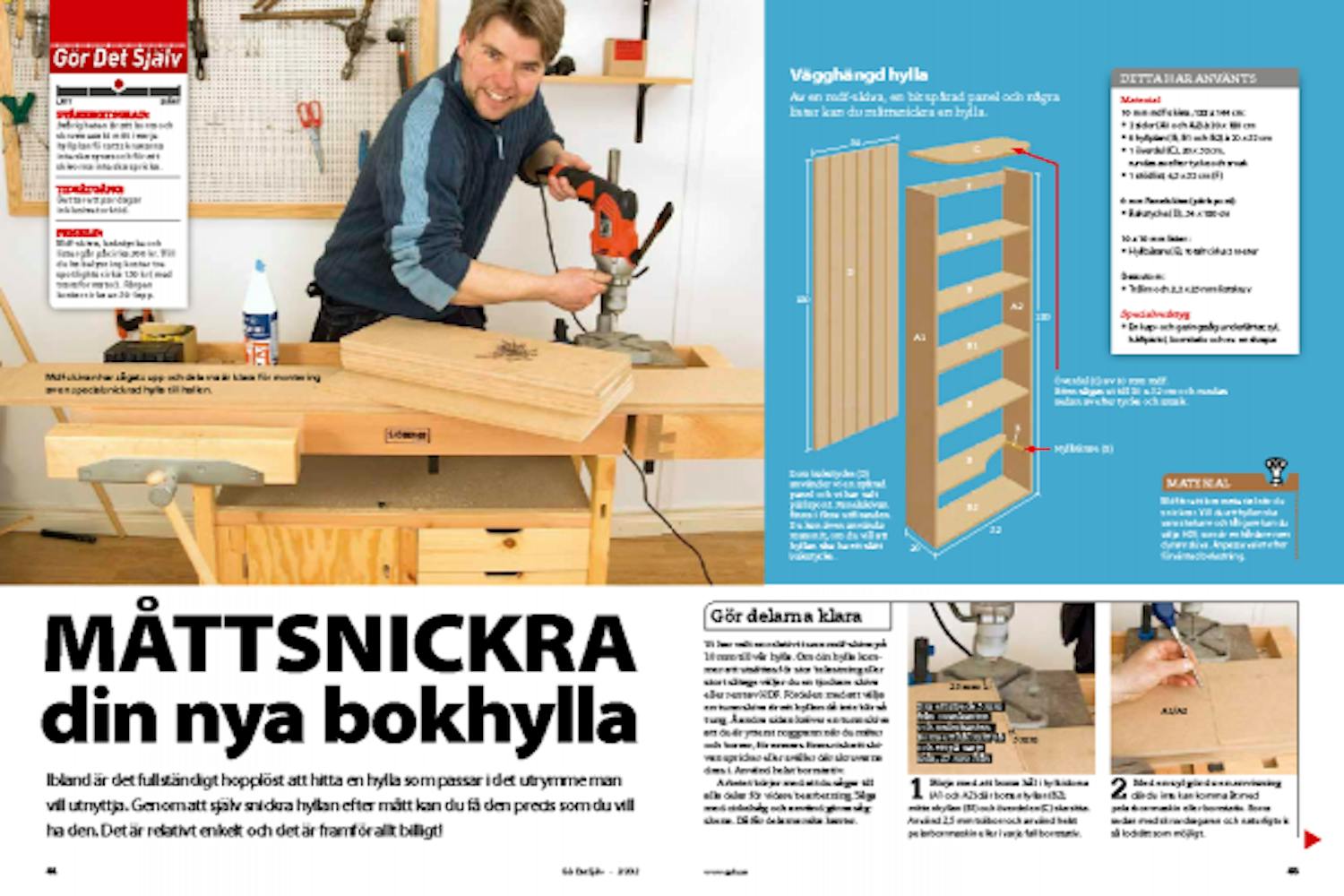 När limmet har härdat kan du lägga på de lösa hyllplanen. Vår hylla har två lösa hyllplan (B) ovanför respektive under det fasta hyllplanet (B1) i mitten. Antal hyllplan och placeringen av dem bestämmer du förstås själv.