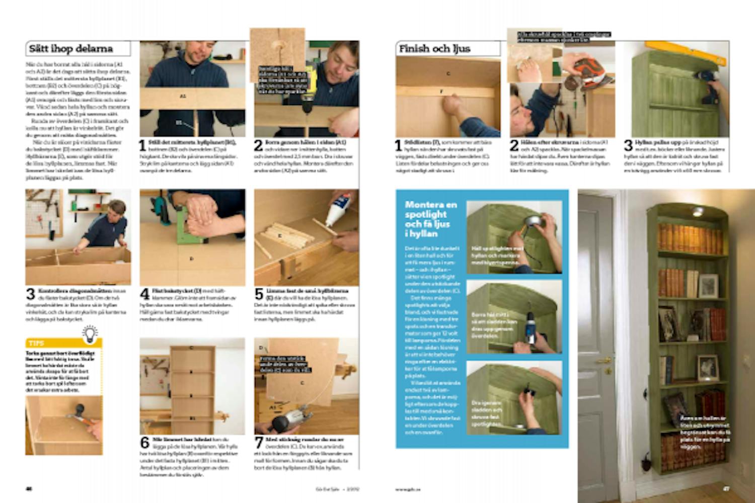 När du är säker på vinklarna fäster du bakstycket (D) med häftklammer. Hyllbärarna (E), som utgör stöd för de lösa hyllplanen, limmas fast. När limmet har härdat kan de lösa hyllplanen läggas på plats.