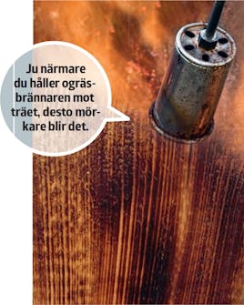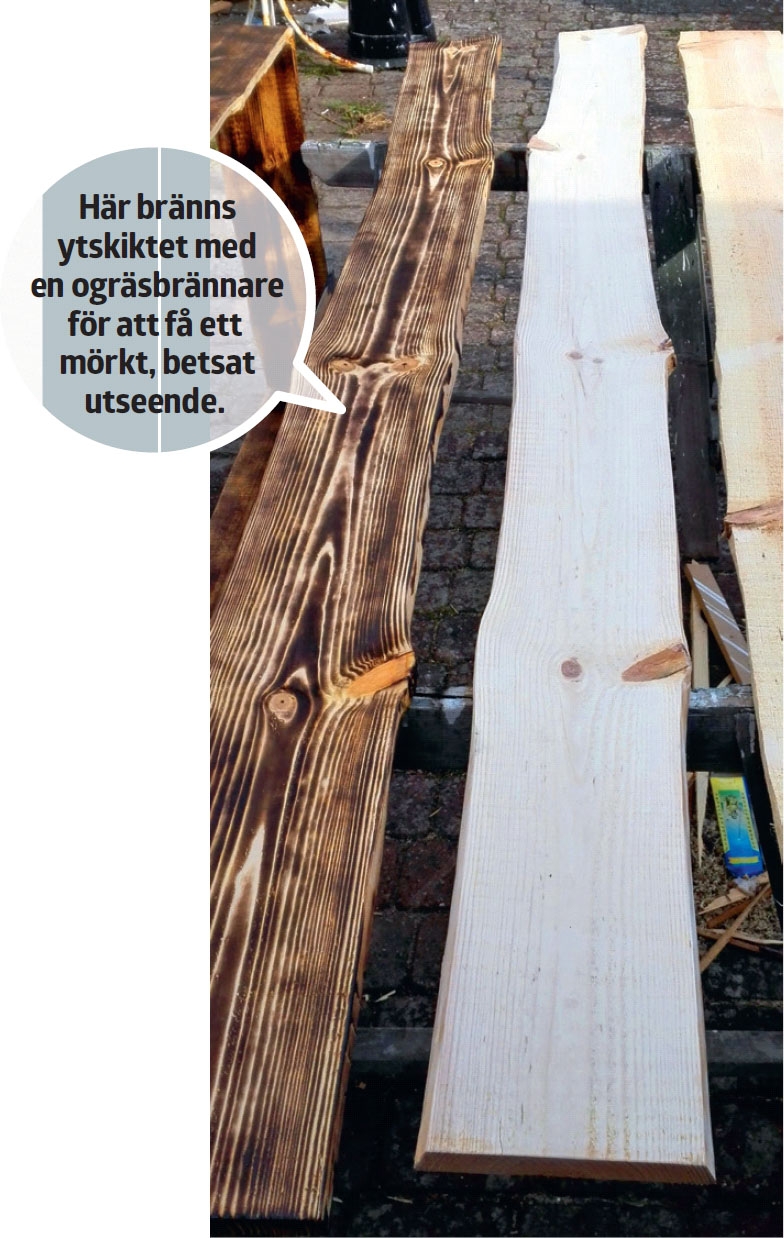 Brädorna är kapade i längden och rakt avsågade på långsidorna som ska sitta mot väggen. Brädornas oregelbundna och organiska kant bibehålls på framkanten. Det brända utseendet som ytskiktet har, har vi fått till med en ogräsbrännare. Ytskiktet är sedan slipat, innan träet avlutningsvis har fått ett lager lack.
