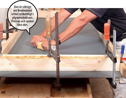 Pressa fast linoleumet i skivan, t.ex. med en brödkavel. Sedan kan du spänna reglar eller balkar runt kanten med tvingar för att hålla linoleumet på plats, medan limmet torkar. Eller så du kan lägga en skiva med något tungt ovanpå.