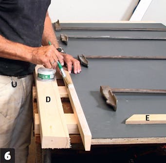 Såga till sidolisterna (D och E). När de är riktade på de två sidorna (en bred och en kort, som är i vinkel), sågas de i vinkel på bordcirkelsågen. Listernas bakkanter ska vara 2,5 cm tjocka, framkanterna 1,5 cm.