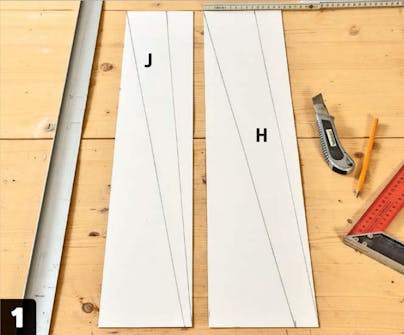 Rita ut mallen till benen (H och J) på två kartongbitar enligt måtten på arbetsritningen. Se till att vara noggrann, så att du inte behöver rikta upp benen senare under arbetet.