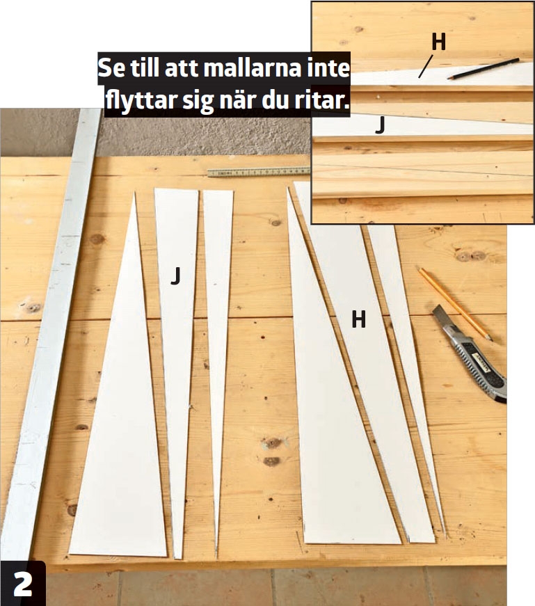 Skär ut de två mallarna med en vass hobbykniv. Det kan vara en bra idé att skära efter en linjal så att du får ett helt rakt snitt. Lägg därefter mallarna på träet och rita upp.