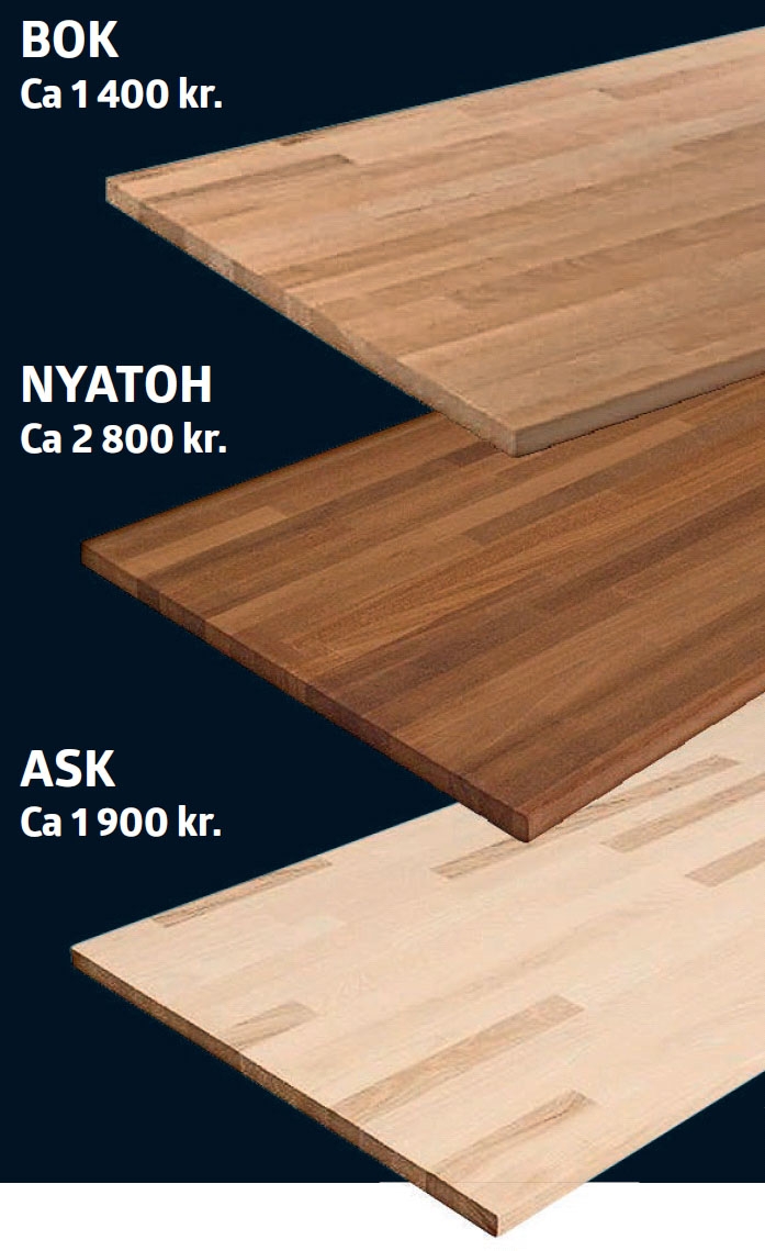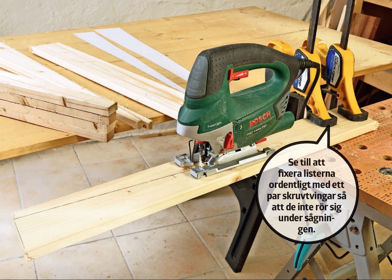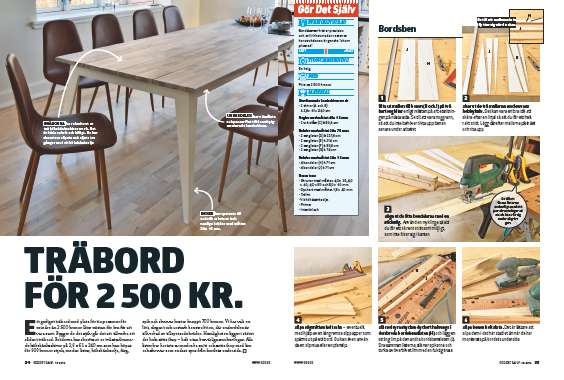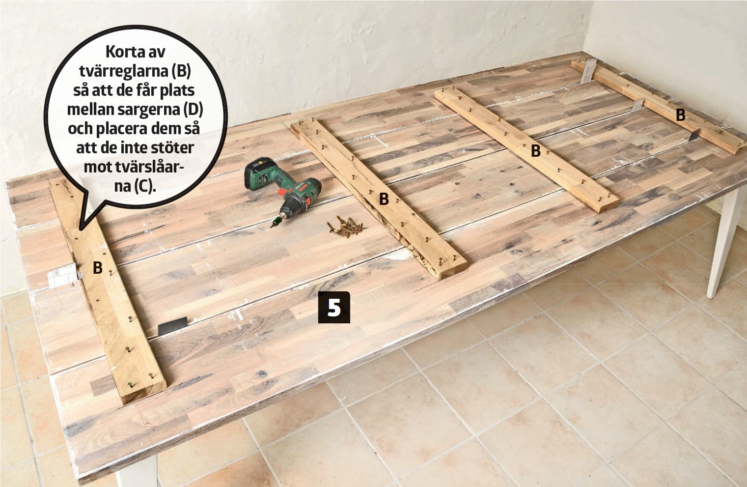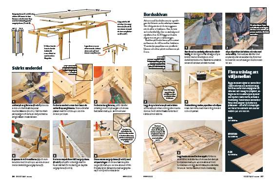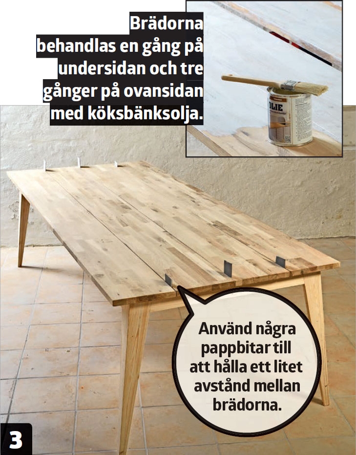 Arbetet med bordsskivorna är egentligen det lättaste under arbetsprocessen. Det viktigaste är att du är noggrann när du skär ut brädorna. Har du inte en bordscirkelsåg eller en sänksåg med styrskena kan du få byggvaruhusets sågservice att göra utskärningen.