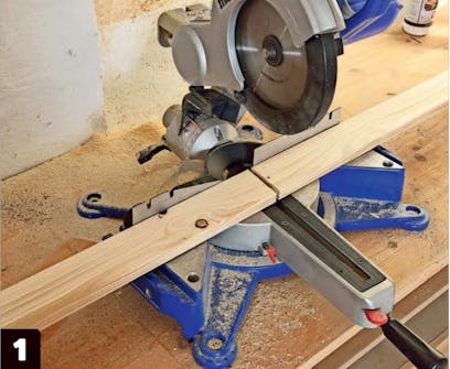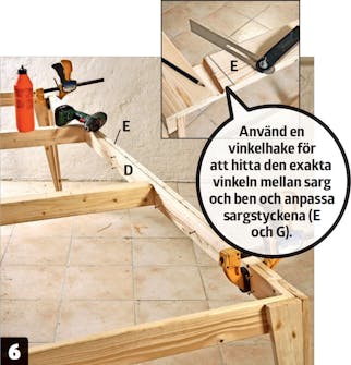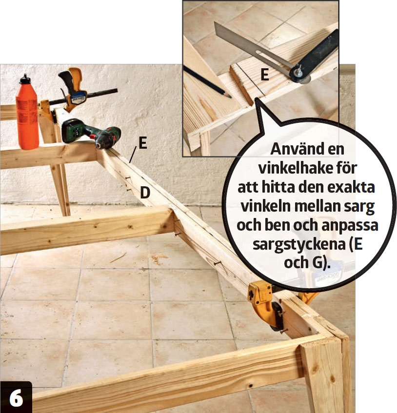 Snittet på sarglisterna (D och F) ska vara 8 mm ur vinkel så att de passar med bordsbenen (H och J). Ställ in vinkeln på kapsågen och korta av de fyra listerna enligt måtten i materiallistan.