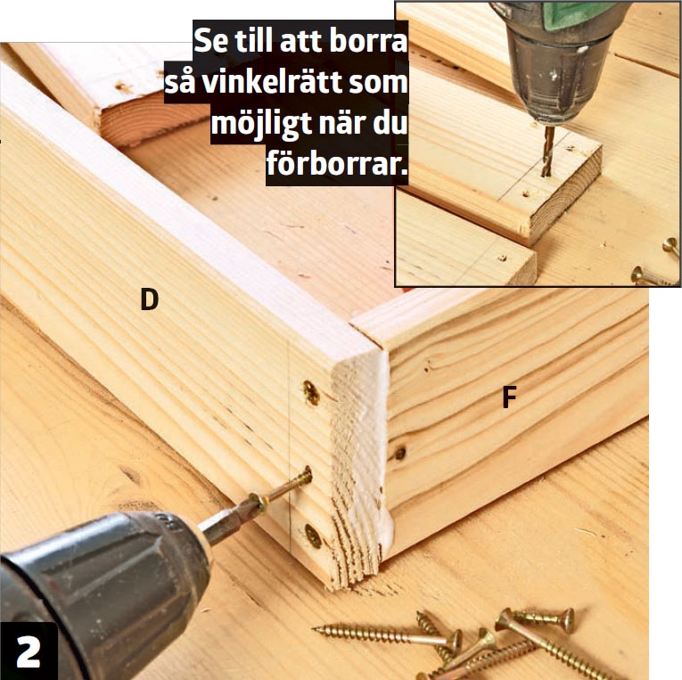 Förborra med ett 4 mm-borr innan du sätter ihop sarglisterna. Skarva därefter plattan med lim och tre 4,0 x 50 mm-skruvar per skarv.