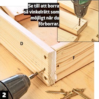 Borra 18 respektive 8 hål i sargstyckena (D och F) och påför ordentligt med lim. Nu är det klart för montering av de yttre sargstyckena (E och G).