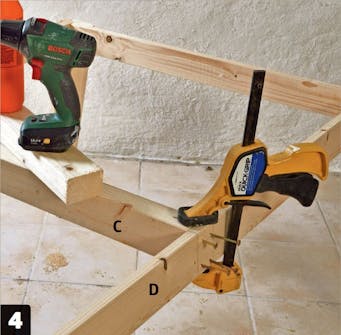 Anpassa de två tvärslåarna (C) och montera dem med lim och 5,0 x 60 mm-skruvar mellan de två långa sargstyckena (D).