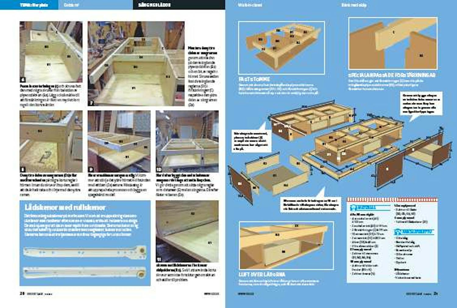 Eftersom hela idén med att utnyttja utrymmet under sängen hänger på lådorna, bygger vi dem naturligtvis så starka och solida som möjligt. De fyra sidorna består av 12 mm plywood och lådbotten av 6 mm tjock plywood. På tre av sidorna sågar vi ett 6 mm spår för att passa lådbotten. Sedan limmar och spikar vi ihop alltihop och monterar den sista sidan och lådskenorna. När lådan är rätvinklig och ser ut som den ska monterar vi den extra frontpanelen så att lådan stängs ordentligt.